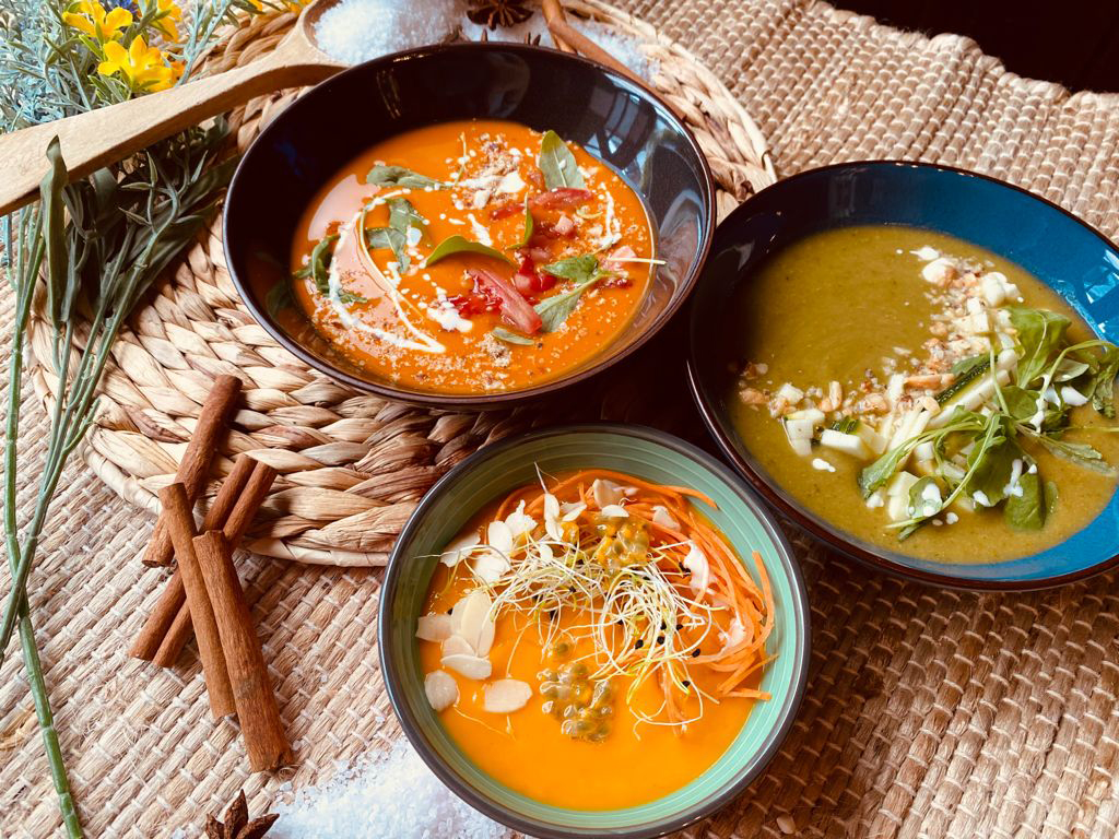 Potages frais faits maison le matin même avec des légumes du potager.